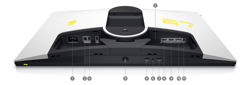 1.電源接頭 | 2.超高速 USB 5Gbps (USB 3.2 Gen 1) Type-B 上行連接埠 | 3.超高速 USB 5Gbps (USB 3.2 Gen 1) Type-A 下行連接埠 (3) | 4.OSD 操縱桿 | 5.超高速 USB 5Gbps (USB 3.2 Gen 1) Type-A 下行連接埠,支援充電功能 | 6.耳機連接埠 | 7.安全防盜鎖孔 (採用 Kensington Security Slot™) | 8.HDMI 連接埠 (HDMI 1) | 9.HDMI 連接埠 (HDMI 2) | 10.顯示器連接埠 | 11.訊號線輸出連接埠隨附的纜線: