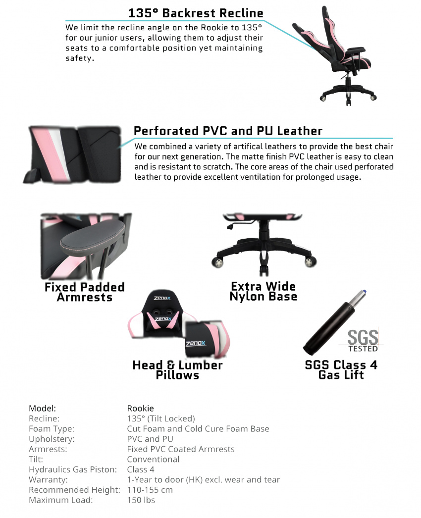 Rookie電競椅專為小童和青少年而設,坐椅尺寸比一般電競椅小,請清楚細閱下列資料和尺寸。