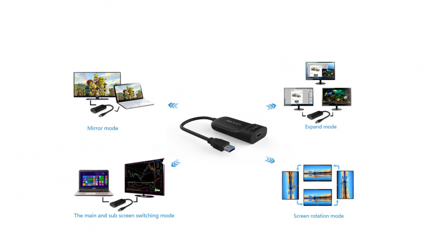 Supports four display modes including extension, synchronized, rotation and switching from main screen. HDMI cable, extensible USB connectivity to any HDMI Displays or projectors.