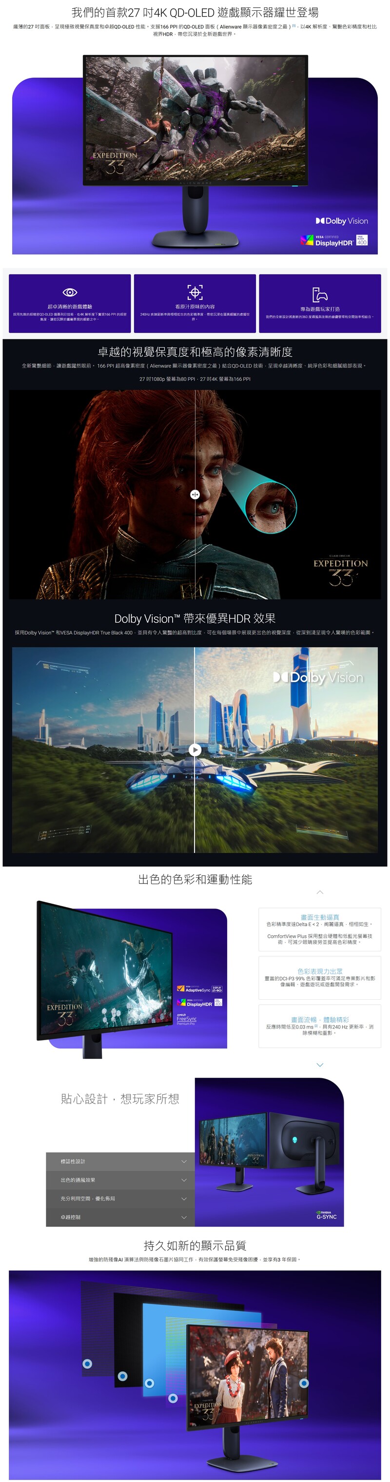 纖薄的 27 吋 面板,呈現極致視覺保真度和卓越 QD-OLED 性能。支援 166 PPI 的 QD-OLED 面板[Alienware 顯示器像素密度之最]