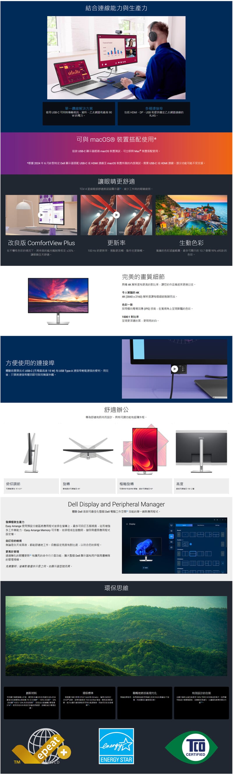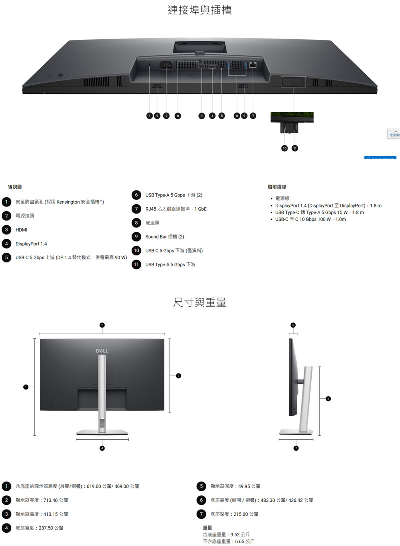 這款 USB-C 顯示器經過 macOS 裝置測試,可立即與 Mac® 裝置搭配使用。 使用 USB-C 可同時傳輸視訊、資料、乙太網路和最高 90 W 的電力。 多種連接埠: 包括 HDMI、DP、USB 和提供穩定乙太網路連線的 RJ45。 更新率: 100 Hz 的更新率、捲動更流暢,動作也更順暢。約 10.7 億種 99% sRGB 的色彩。 ComfortView Plus : 在不犧牲色彩的情況下,將有害的藍光輻射降低至 ≤35%,讓眼睛全天舒適。