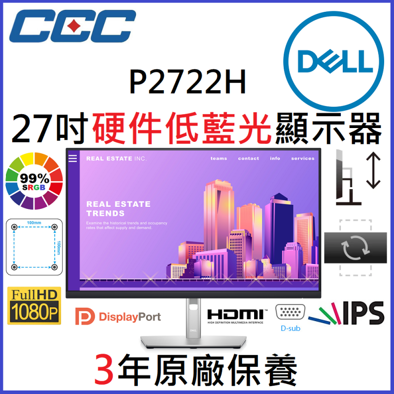 LED邊緣照明系統, 99% sRGB色域, 無閃爍技術, 無汞, 無砷玻璃, Dell ComfortView Plus