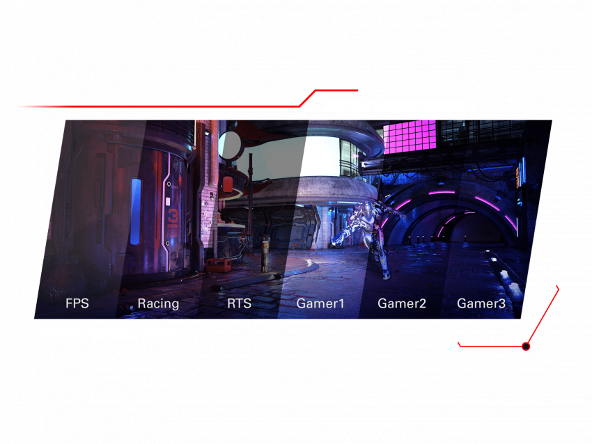 特別為不同的遊戲強化色彩和清晰度,並提供六種模式可供選擇:FPS,Racing,RTS,Gamer1,Gamer2 和Gamer3。 FPS:用於第一人稱射擊遊戲,可在較暗的畫面中改善黑色的細節部份。 賽車:用於玩賽車遊戲,提供最快的反應時間及高色彩飽和度。 RTS:用於即時策略遊戲,讓用戶僅突出顯示的其中一部份,並根據需要調整圖像質量和細節。 Gamer1、Gamer2、Gamer3:三種不同的自訂模式,用戶可以保存自己喜歡的設置。