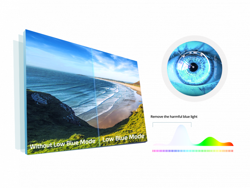 長時間接觸藍光可能會導致眼睛疲勞、睡眠障礙或頭痛,淨藍光功能藉由控制色溫,有效減少有害的藍光光波。