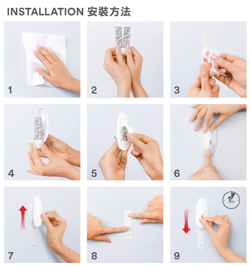 6. 將掛鈎貼於牆上,按壓30秒。