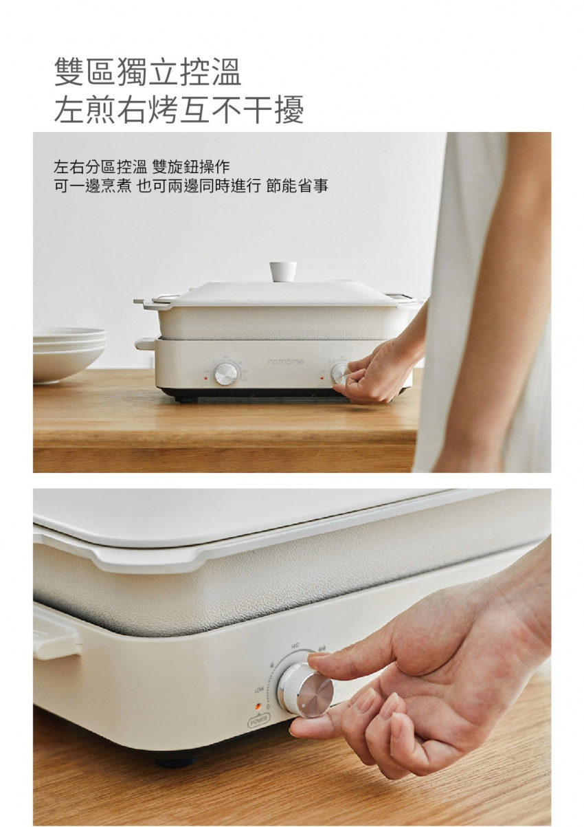- 雙區獨立控溫,面式發熱均勻,左右分區控溫,雙旋鈕操作, 節能省事