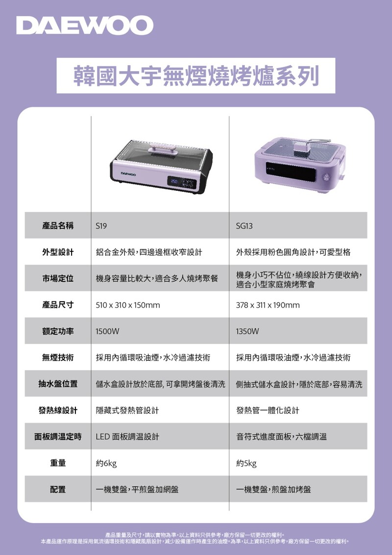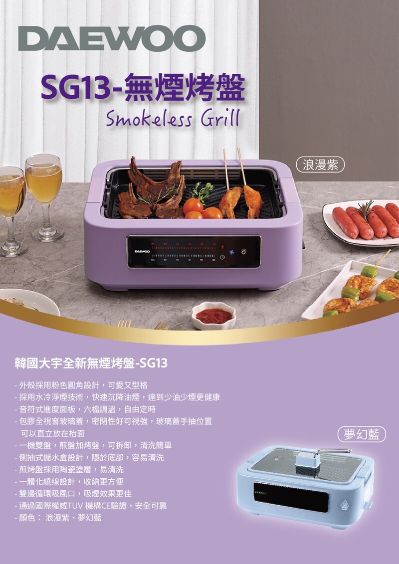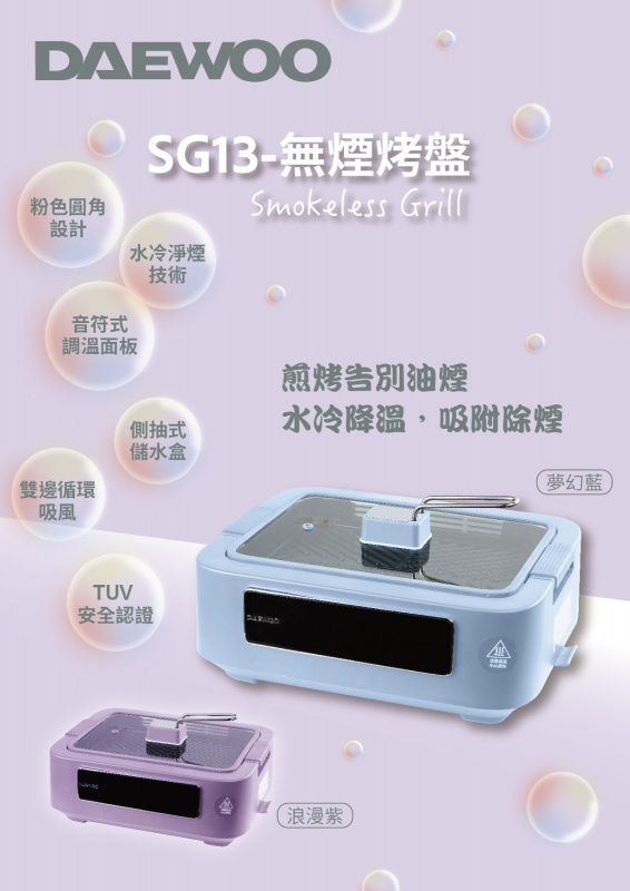 韓國大宇推出最新的 SG13 無煙烤爐,外型以粉色圓角設計,小巧實用,音符式面板調溫,操作簡易,