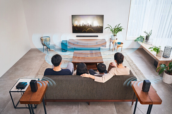 有了無線擴音器為後置揚聲器供電,你房間的前後就不需要電線連接。重低音揚聲器與 Soundbar 共用一個電源連接,讓系統能呈現影院音效,更沒有電線纏繞帶來的煩惱。