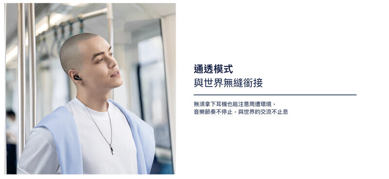 • 通透模式|開啟通透模式,無須拿下耳機也能注意周遭環境,音樂節奏不停止,與世界的交流不止息