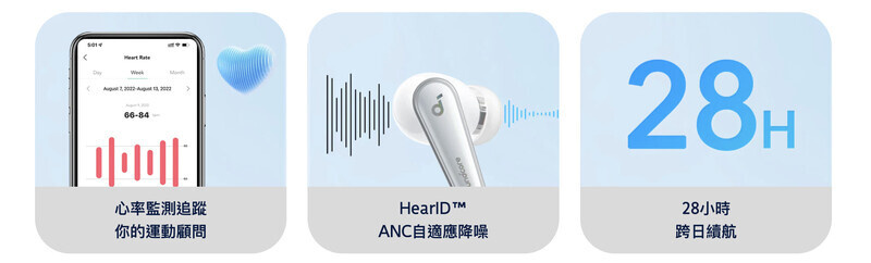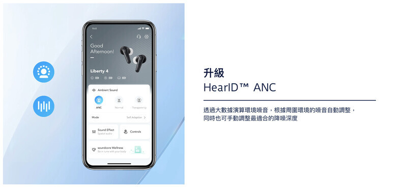 • HearID™  ANC|透過大數據演算環境噪音,根據周圍環境的噪音自動調整,同時也可手動調整最適合的降噪深度