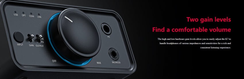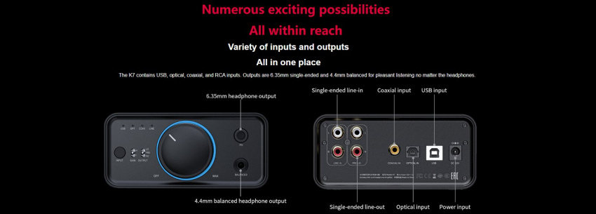 K7 配置了 USB、光纖、同軸、RCA 輸入介面;還配置了 6.35mm、4.4mm 輸出介面,單端、平衡都支持,精彩一如既往。