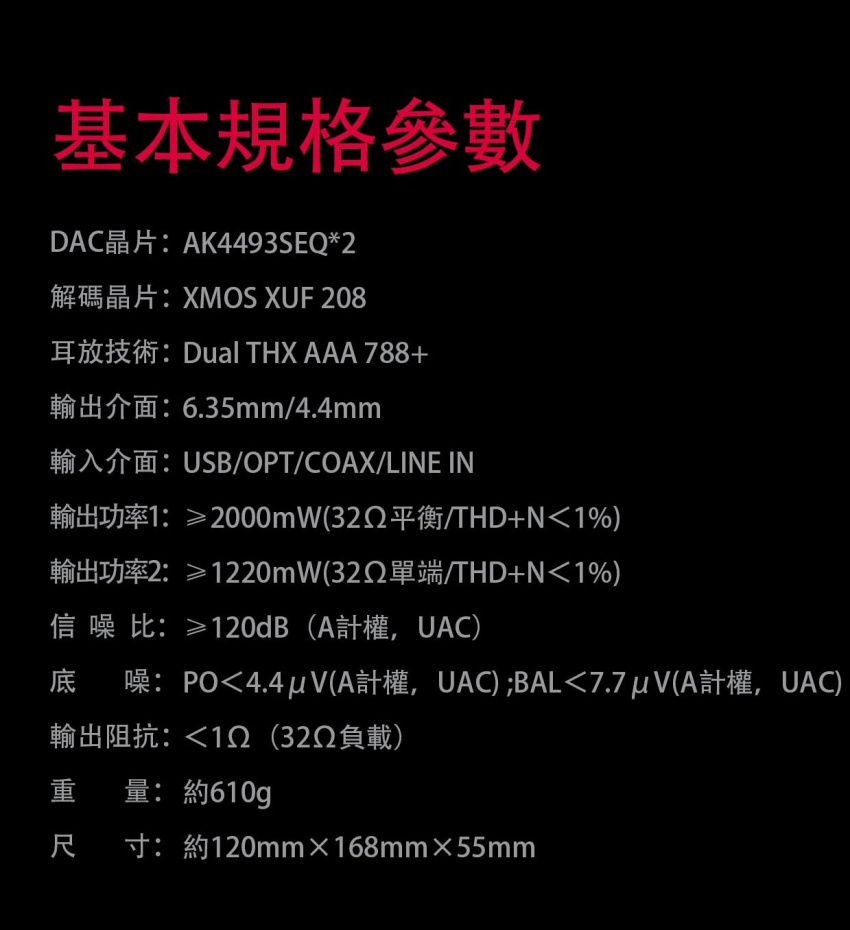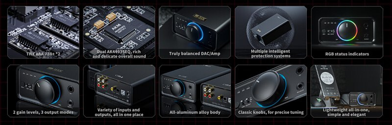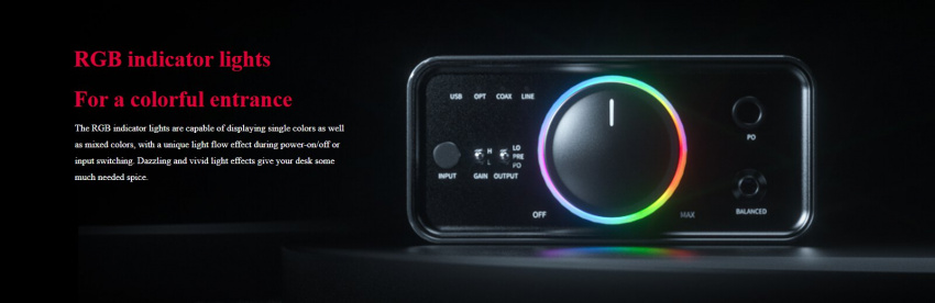 真平衡解碼耳放 | THX AAA 788+耳放技術 | 高性能雙DAC AK4493S 多重智慧保護電路 | 多路獨立LDO供電 | 標配12V/24W低雜訊電源 多彩RGB晶片燈 | 三檔輸出切換 | 兩檔硬體增益選擇 | 豐富輸入輸出介面