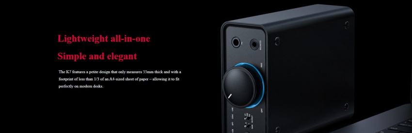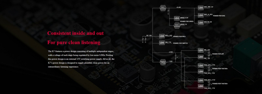 K7 採用分級、獨立供電,每級都通過低雜訊 LDO 進行穩壓,同時外置獨立 12V 開關電源供電,電源更純淨,動力更強勁,聆聽體驗更是非同凡響。