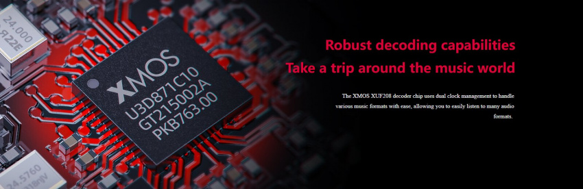 XMOS XUF208 解碼晶片採用倍頻管理技術,應對高規格解碼遊刃有餘,駕馭各種音樂場景都不在話下。
