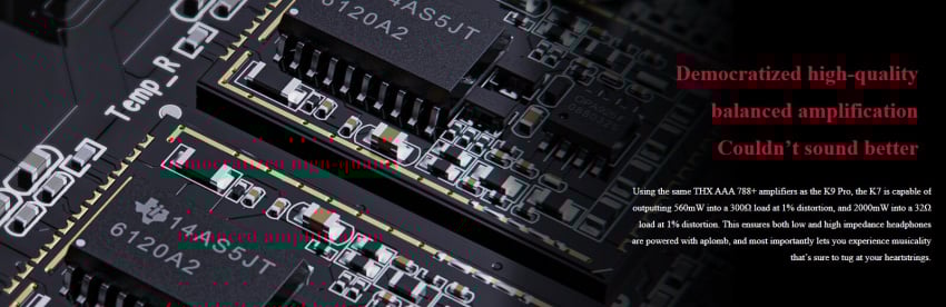 使用高端台放 K9 Pro 同款 THX AAA 788+,300Ω 負載時 1% 不失真功率可達 560mW,32Ω 負載時 1% 不失真功率可達 2000mW,驅動低阻和高阻耳機都有優秀的細節和動態,每一次聆聽,都觸動心弦。