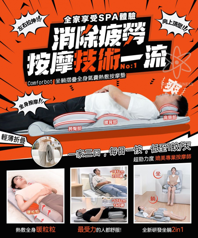 6種自動模式,坐躺二合一,覆蓋頸部、背部、腰部、臀部,在家輕鬆做SPA。