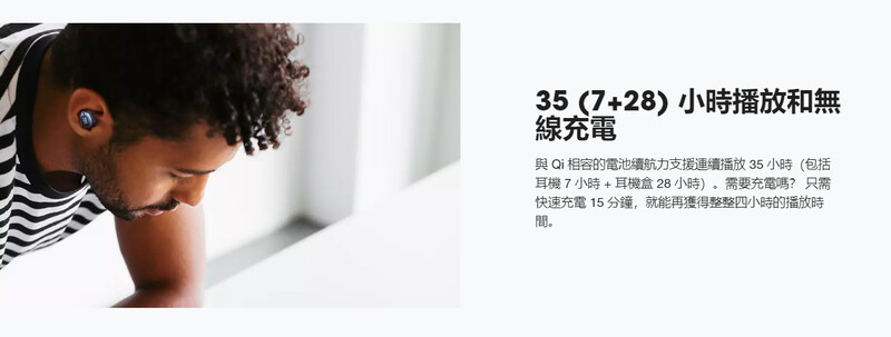 與 Qi 相容的電池續航力支援連續播放 35 小時(包括耳機 7 小時 + 耳機盒 28 小時)。需要充電嗎? 只需快速充電 15 分鐘,就能再獲得整整四小時的播放時間。