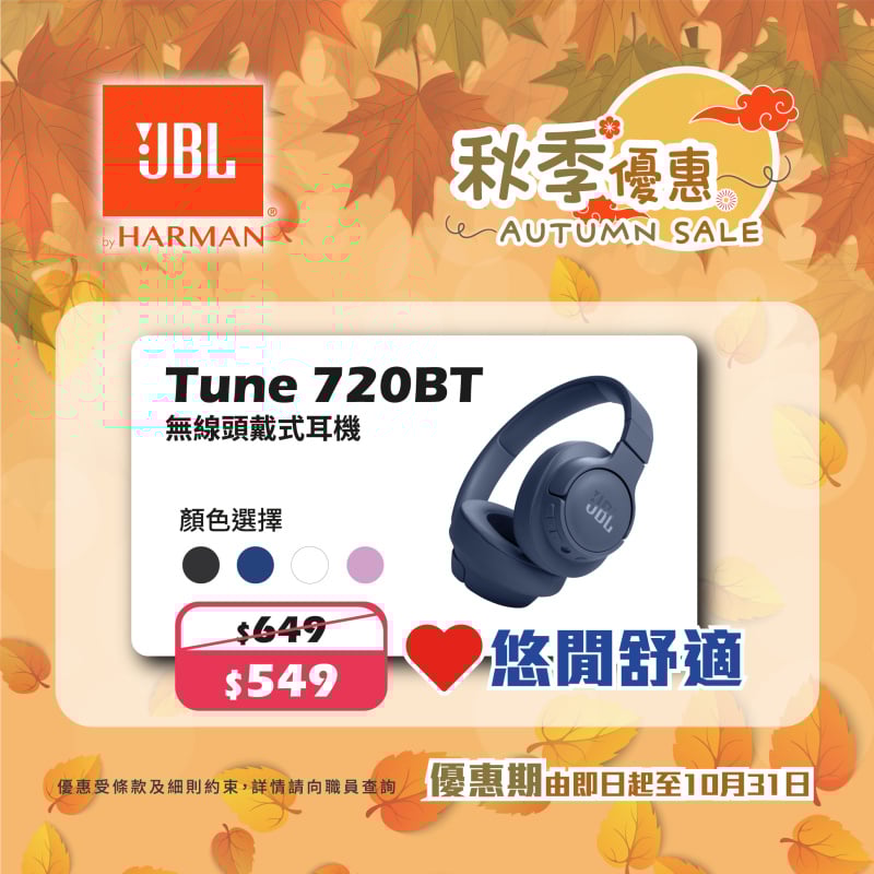 JBL Tune 720BT 採用著名的 JBL Pure Bass 音效,該技術為世界各地最著名的場館提供動力。