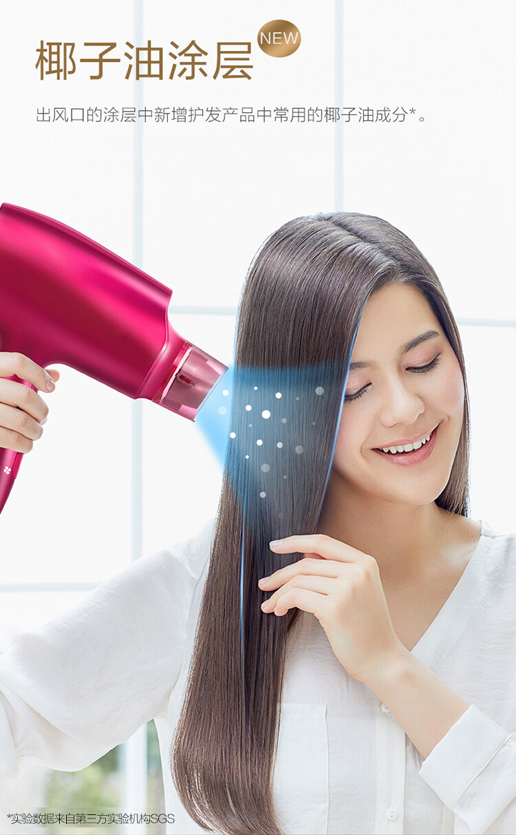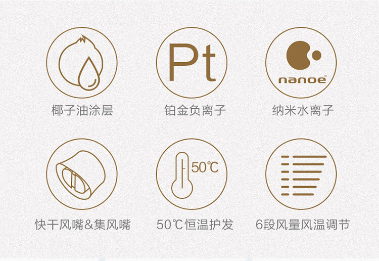椰子油塗層|鉑金負離子|nanoe 納米水離子|快乾風嘴&集風嘴|50° 恒溫護髮|6 段風量風溫調節