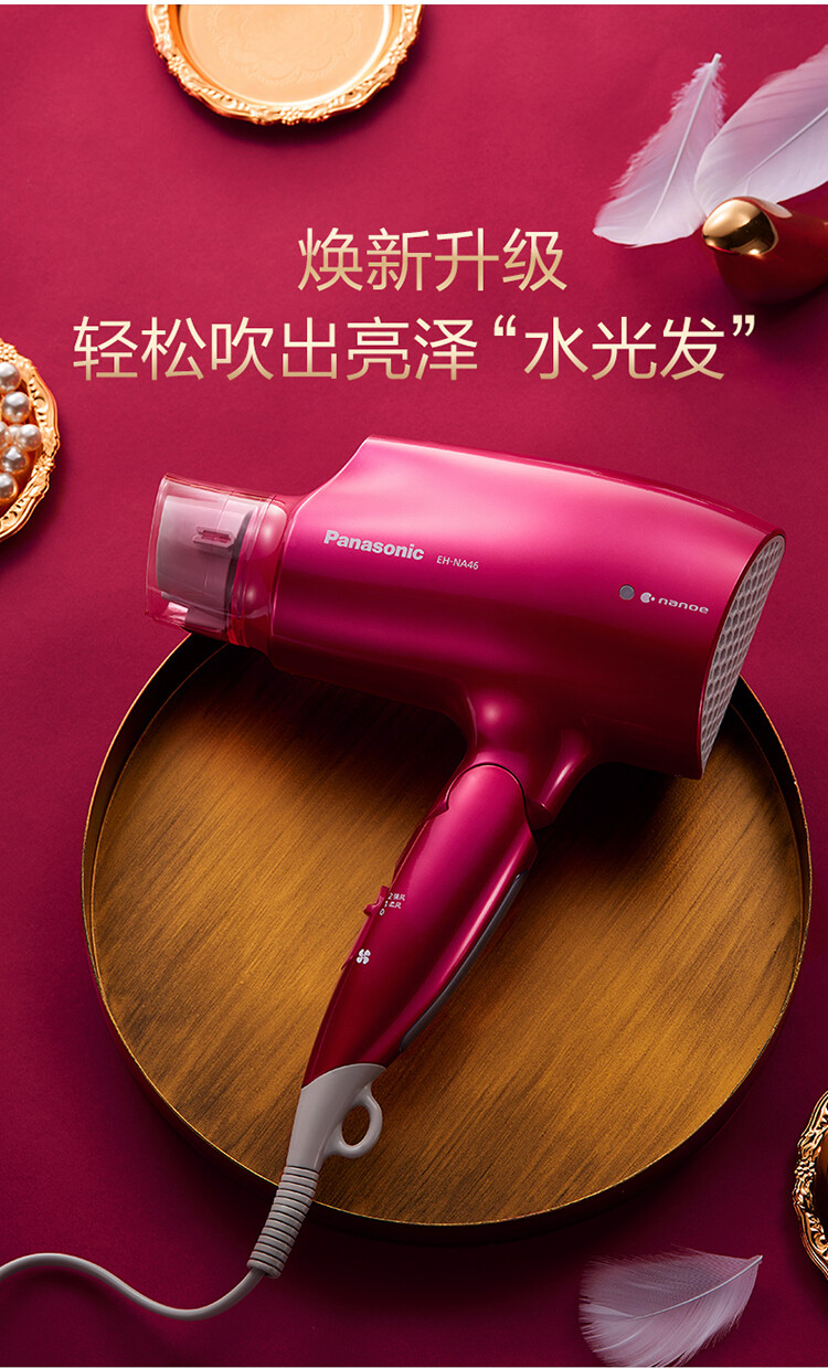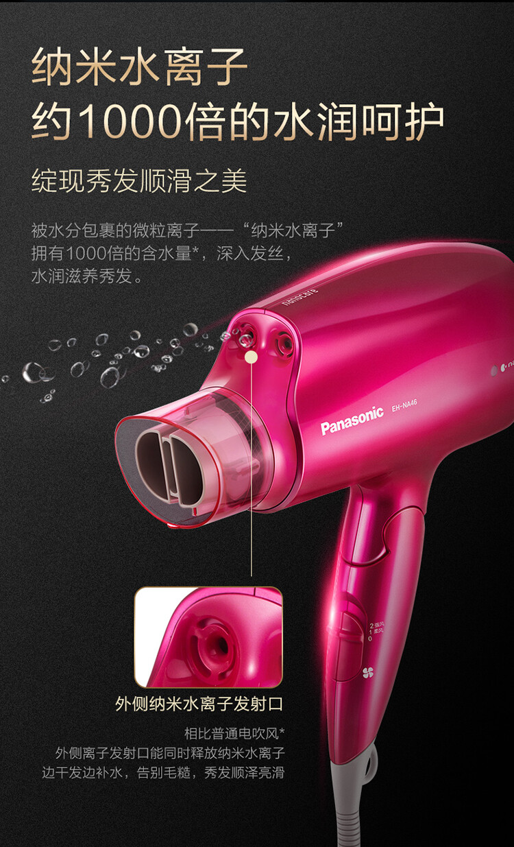 nanoe™ 納米水離子可減少頭髮靜電,撫平毛躁,頭髮水潤服帖,打造服帖順滑的頭髮。