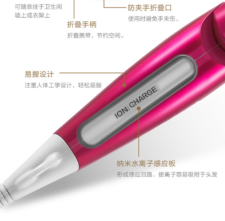 使用過程中,握住手柄外側的離子控制面板, 即可將頭髮上蓄積的負電荷釋放掉,使納米水離子和鉑金負離子更易附著在頭髮上,補充水分。