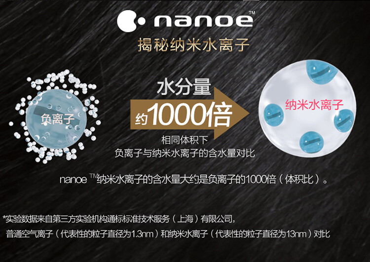 相同體積下,負離子與納米水離子的含水量對比,nanoe™ 納米水離子的含水量大約是負離子的 1000 倍(體積比)。