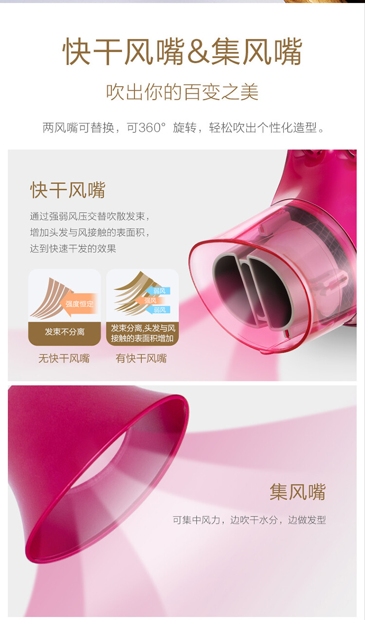 兩風嘴可替換,可360°旋轉,輕松吹出個性化造型。快乾風嘴通過強弱風壓交替吹散髮束, 增加頭髮與風接觸的表面積,達到快速乾發的效果。集風嘴可集中風力,邊吹乾水分,邊做髮型。