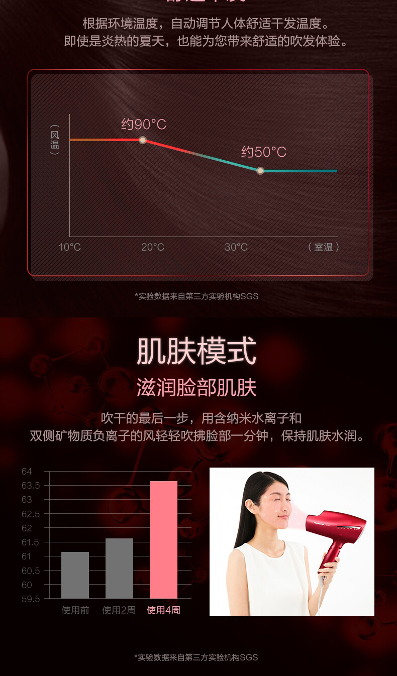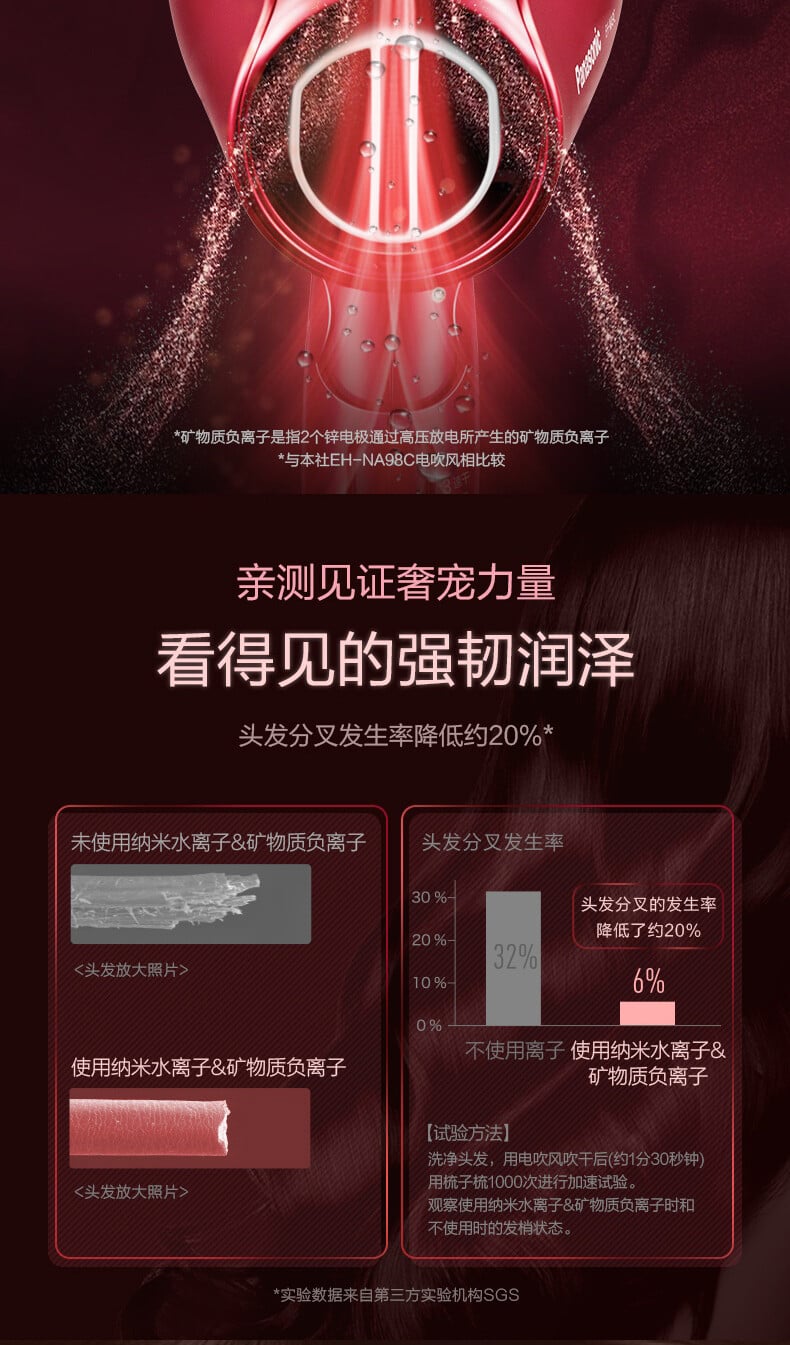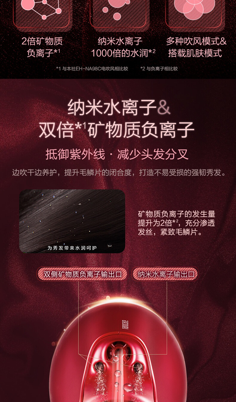 雙倍礦物質負離子|納米水離子 1000 倍的水潤|多種吹風模式+搭載肌膚模式