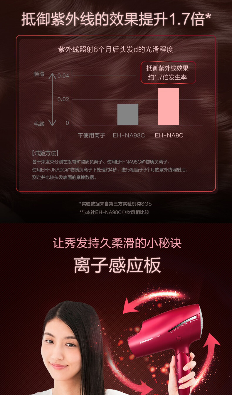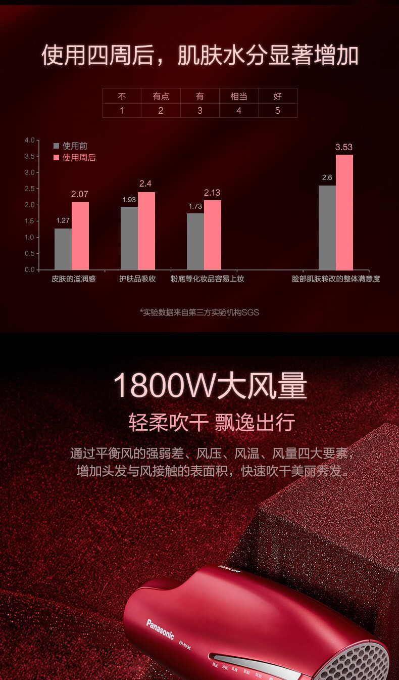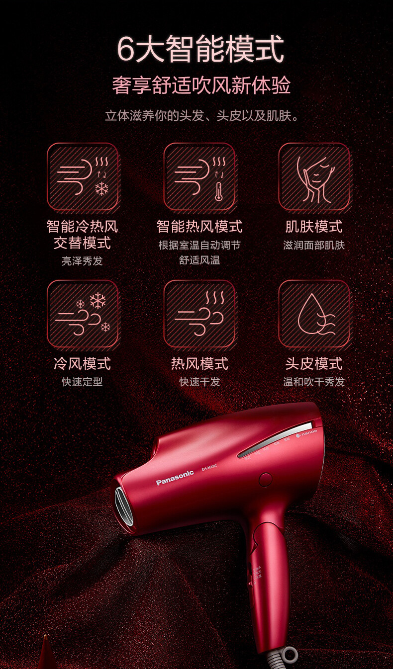 雙倍礦物質負離子|納米水離子 1000 倍的水潤|多種吹風模式+搭載肌膚模式