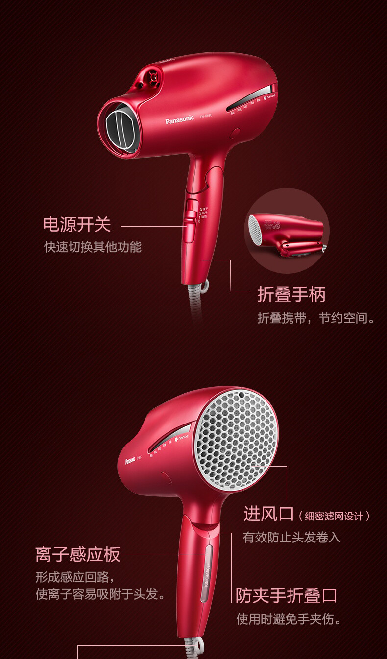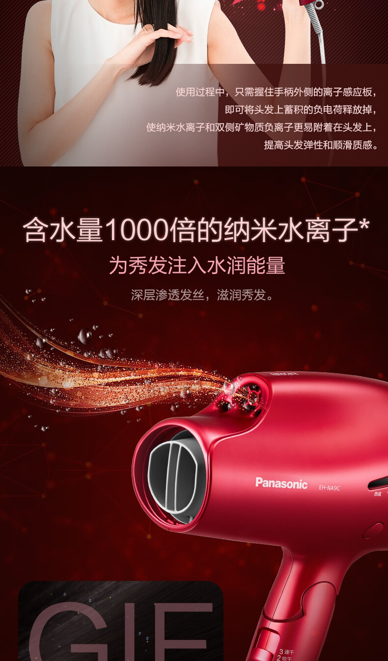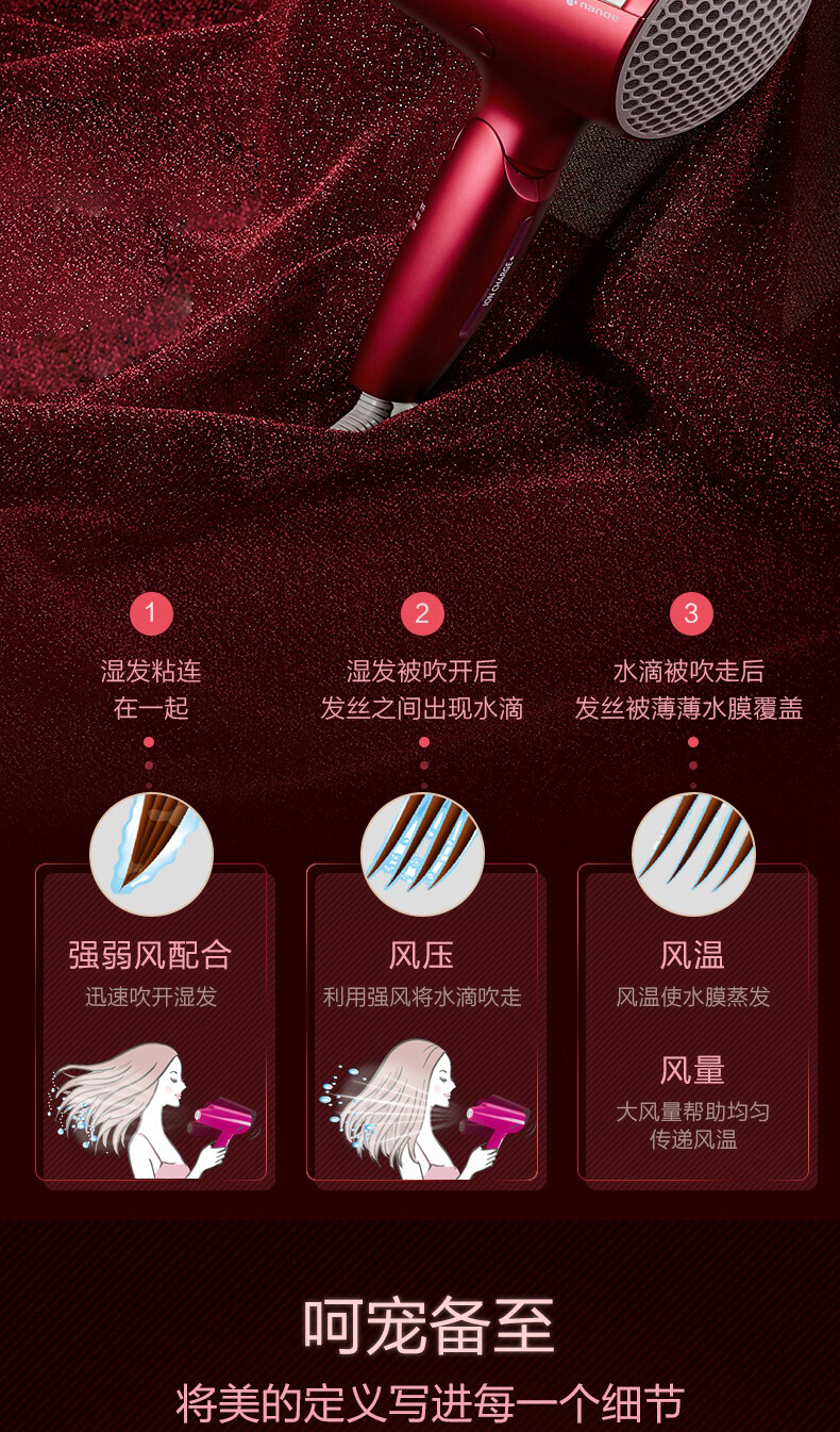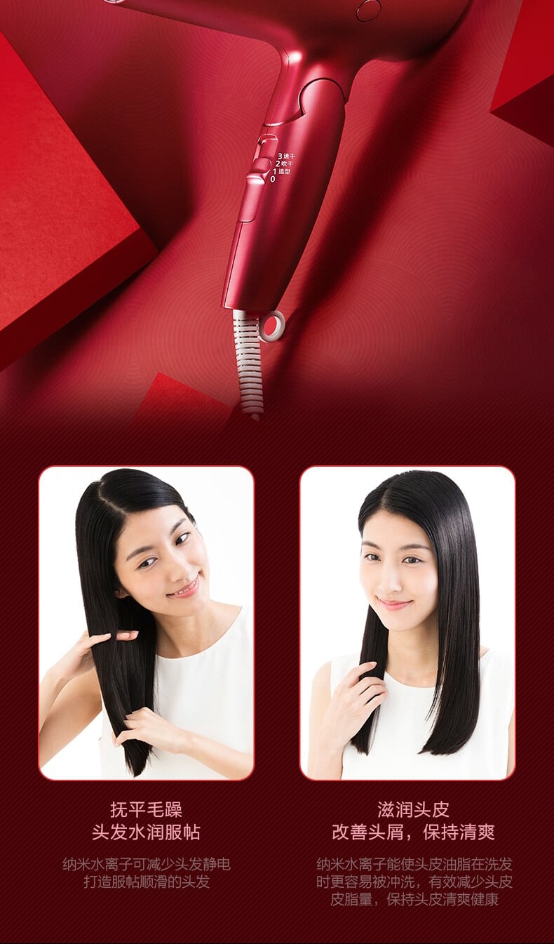 納米水離子結合冷熱風自動交替,抑制頭髮表面過熱,舒適乾髮的同時,亮澤秀發。