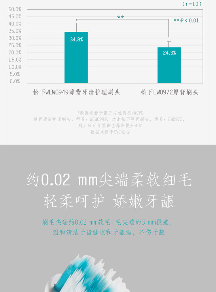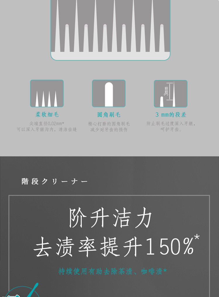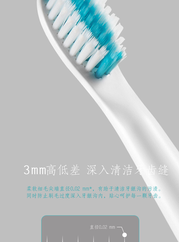 刷毛尖端約 0.02mm 軟毛+毛尖端的 3mm 段差,溫和清潔牙齒縫隙和牙齦溝,不傷牙齦。