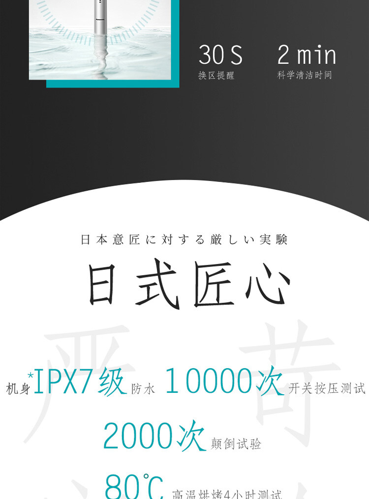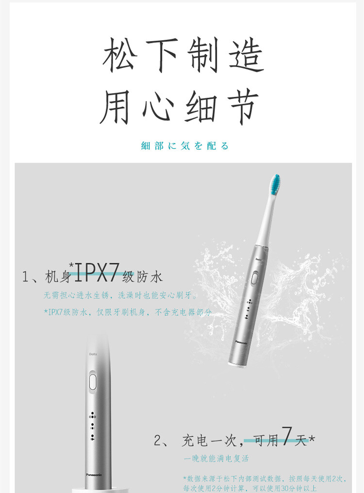 無需擔心進水生鏽,洗澡時也能安心刷牙。 *IPX7 級防水僅限牙刷機身,不含充電器部分。