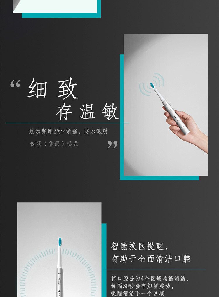 將口腔分為 4 個區域均衡清潔, 每隔30秒會有短暫震動,提醒清潔下一個區域。