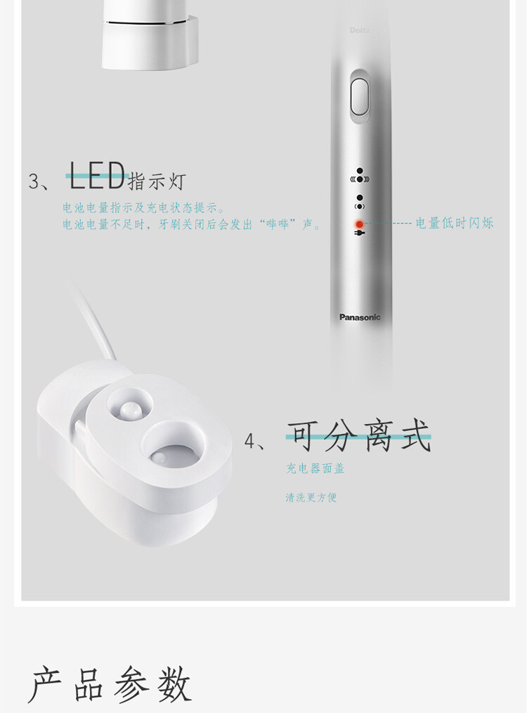 電池電量指示及充電狀態提示。電池電量不足時,牙刷關閉後會發出“嗶嗶”聲。
