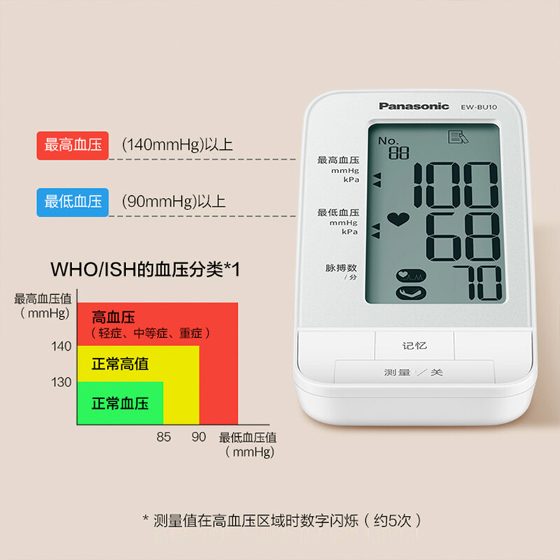 對於最高/最低血壓值以世界衛生組織/國際高血壓學會的血壓值分類表為叢準判斷是屬高血壓區域還是正常區域,高壓區時,測量值會閃爍。