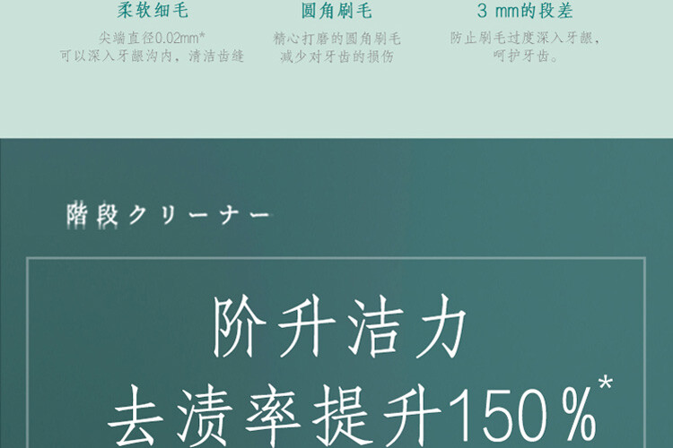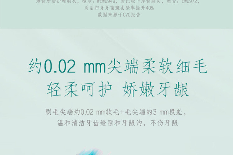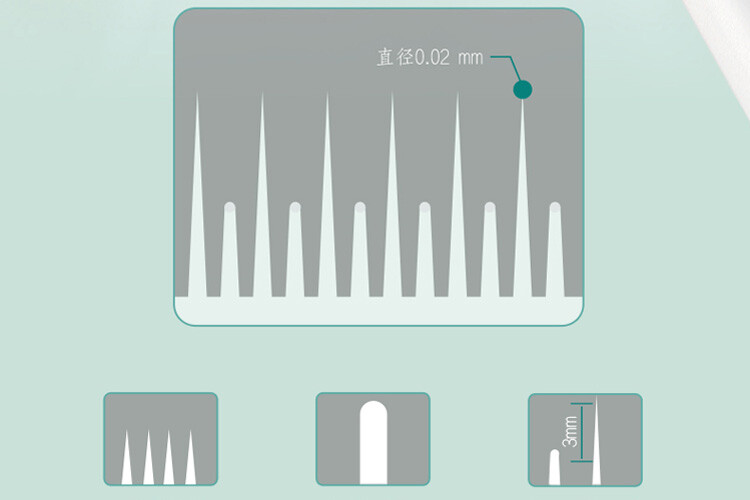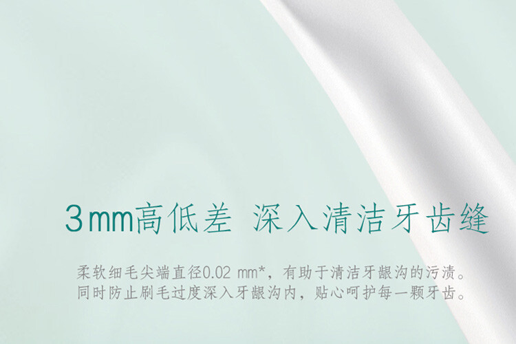 刷毛尖端約 0.02mm 軟毛+毛尖端的 3mm 段差,溫和清潔牙齒縫隙和牙齦溝,不傷牙齦。