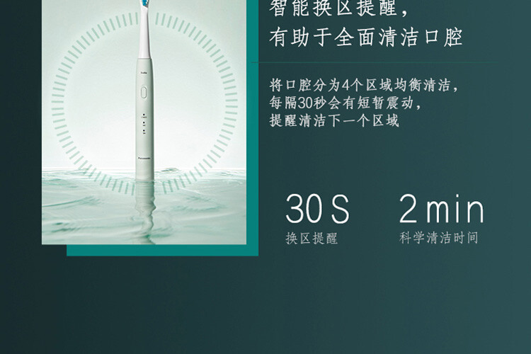 將口腔分為 4 個區域均衡清潔, 每隔30秒會有短暫震動,提醒清潔下一個區域。