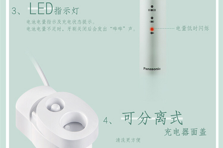 電池電量指示及充電狀態提示。電池電量不足時,牙刷關閉後會發出“嗶嗶”聲。