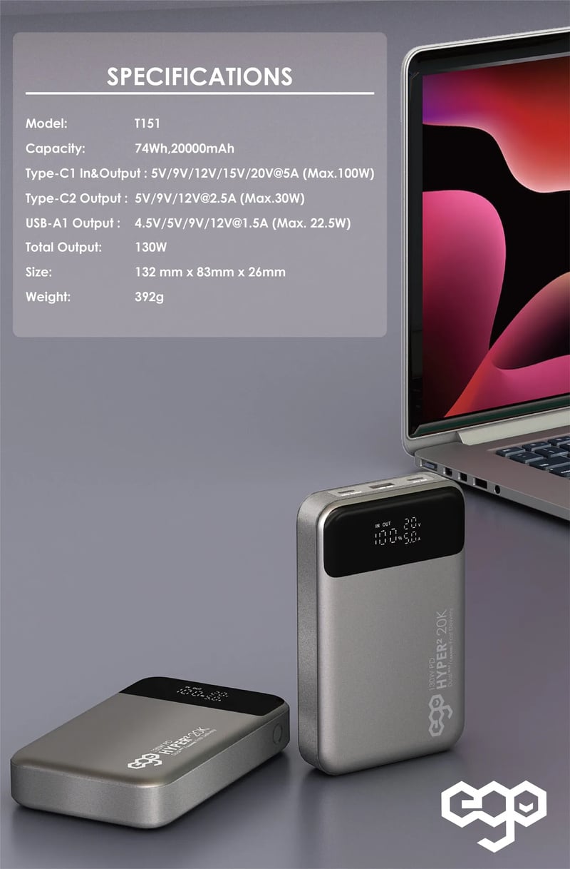 ・Type-C1 輸入/輸出:5V/9V/12V/15V/20V@5A (Max.100W)