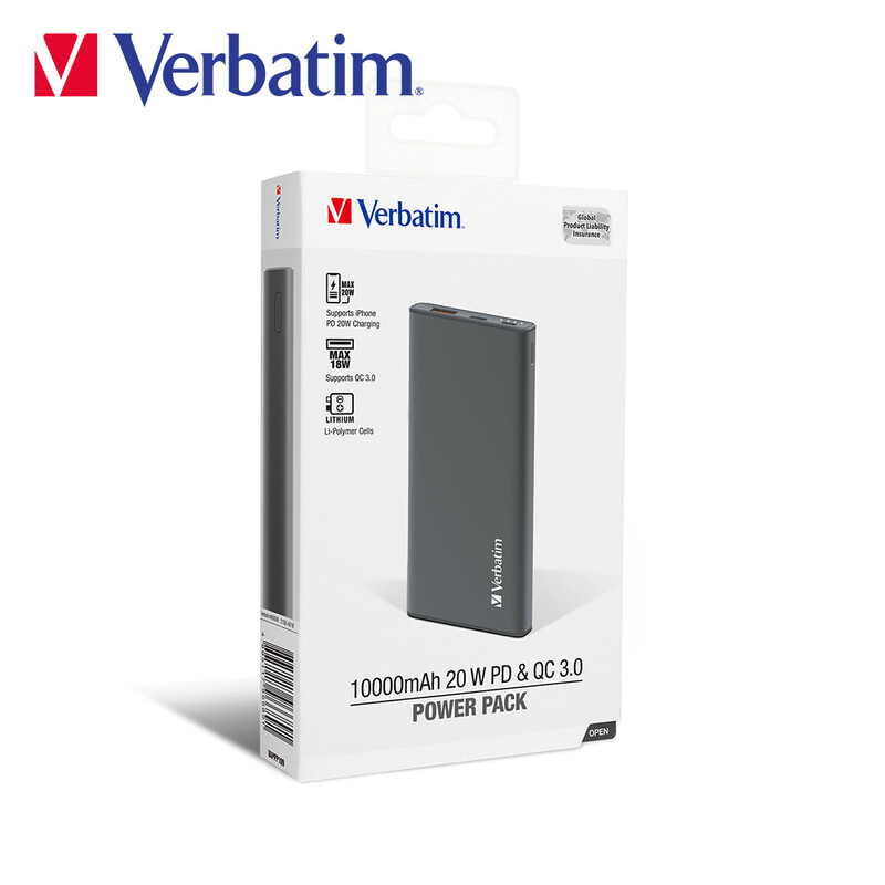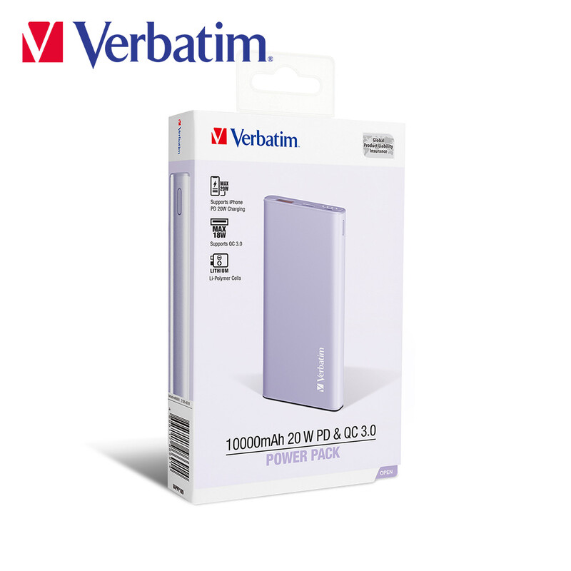 Verbatim 10000mAh 20W PD & QC 3.0 流動充電池最多可同時為 2 台設備充電。結合 PD 3.0 和 QC 3.0 快充技術,它還支援 iPhone PD 20W 充電,能為您的設備快速充電。