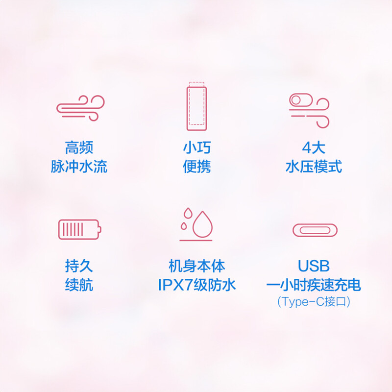 高頻脈沖水流 1400 回/每分鐘|伸縮小圓管|4 大變頻模式,可剛可柔|小巧便攜|持久續航|機身本體 IPX7 級防水|USB 一小時疾速充電