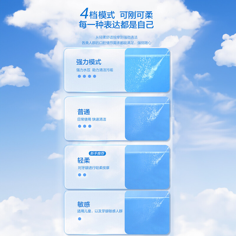 從輕柔舒適按摩到強勁清潔,各類人群的口腔情節需求都能滿足,強弱隨心。