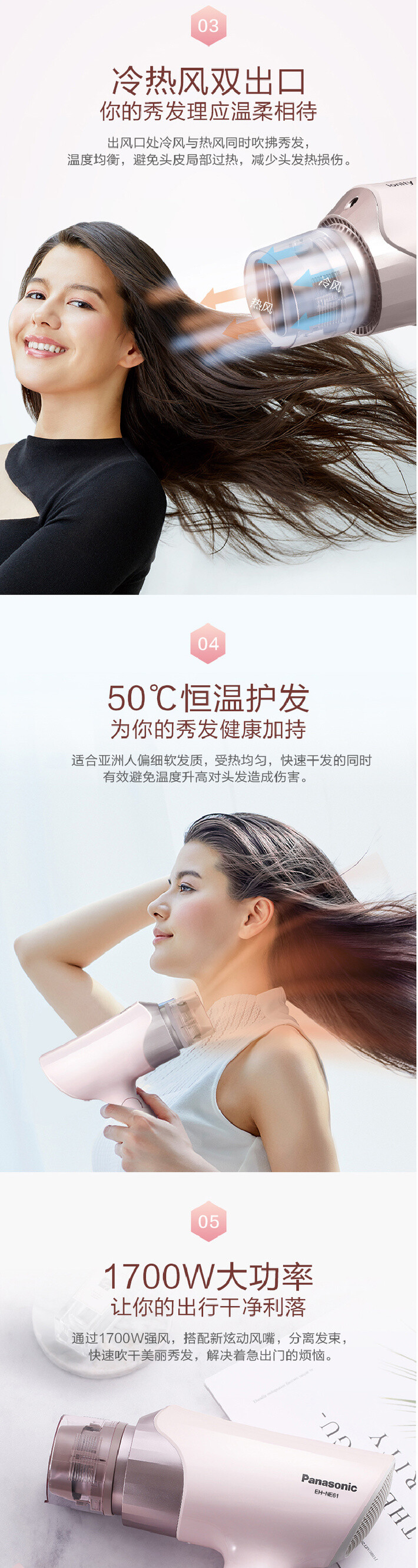 冷熱風雙出口,風溫舒適,防止局部過熱,減少頭髮熱損傷