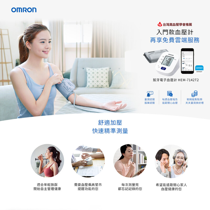 產品具有藍牙傳輸功能,將量測數據上傳至「OMRON connect」。輕鬆查看血壓變化,省去記錄血壓數值的麻煩,更方便於看診時提供