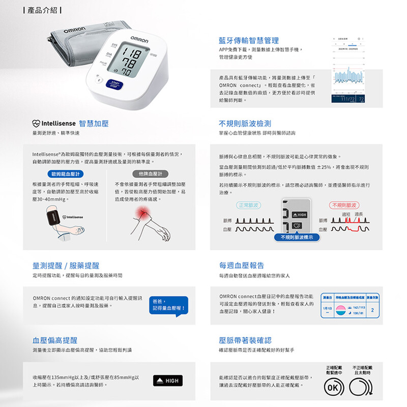 Intellisense® 為歐姆龍獨特的血壓測量技術,可根據每個量測者的情况,自動調節加壓的壓力值,提高量測舒適感及量測的精準度。