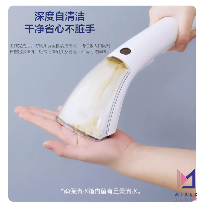 工作完成後,將刷頭調至自清潔模式,堵住吸入口同時長按出水按鍵,輕鬆清洗刷頭及管道,不留污防異味。