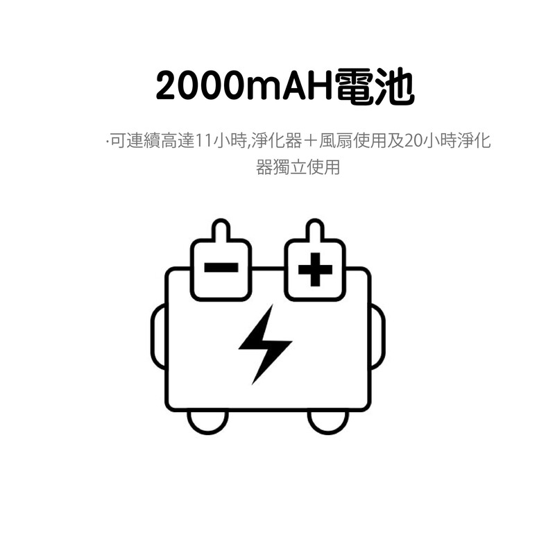 ・2000mAh 電池可連續 11 小時使用淨化器 + 風扇;及 20 小時獨立使用淨化器