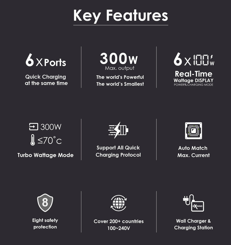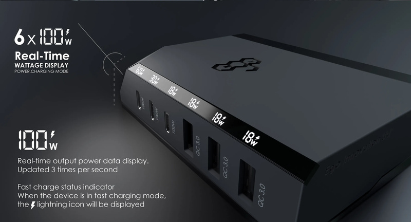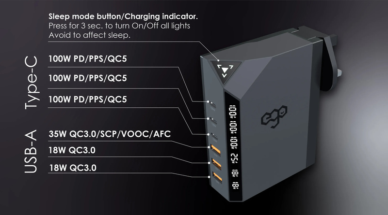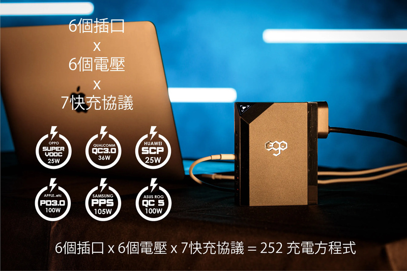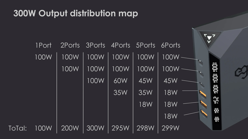・Type-Cx3 Output:5V/9V/12V/15V/20V@5A (PD3.0 Max.100W) , 3.3V~21V@5A (PPS Max.105W),5V/9V/12V/15V/20V@5A(QC5 Max.100W)