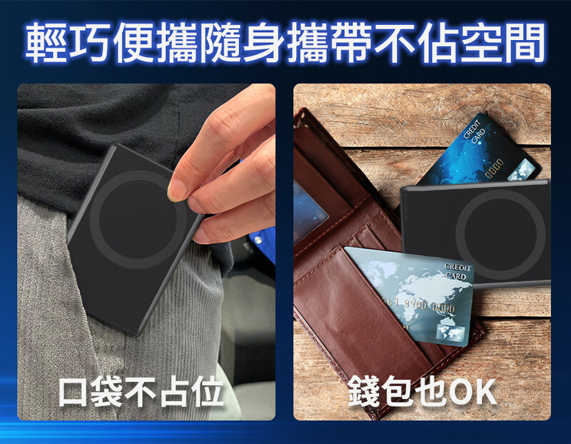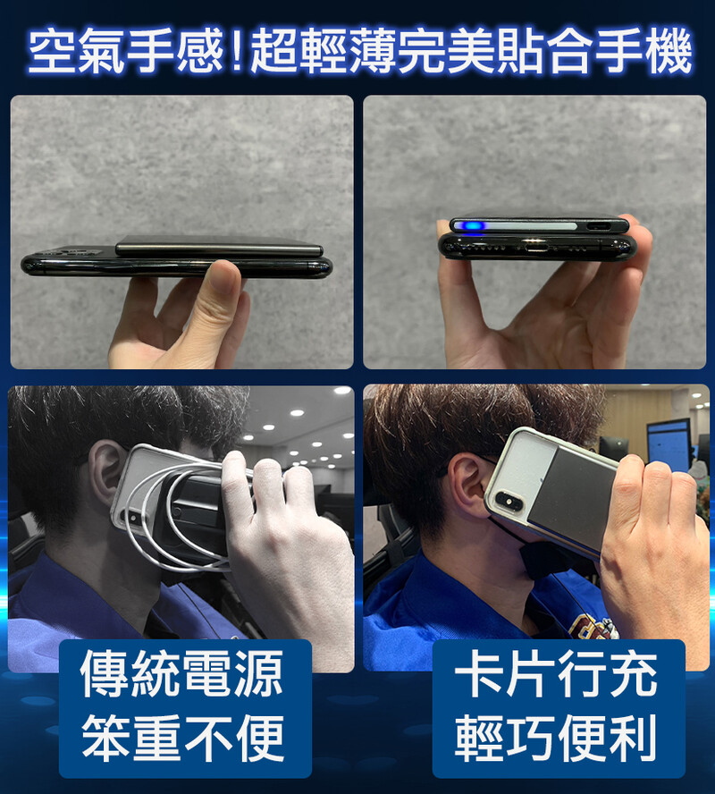 超輕薄空氣手感,完美貼合手機。傳統電源笨重不便,卡片行充輕巧便利。