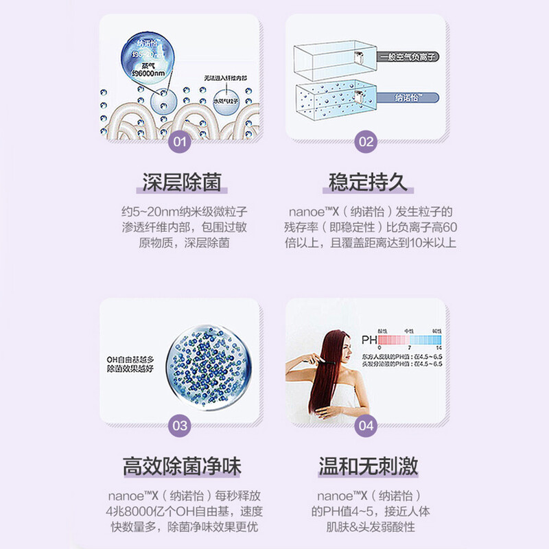 4. 溫和無刺激:nanoe™ X 的 PH 值 4~5,接近人體肌膚&頭髮弱酸性